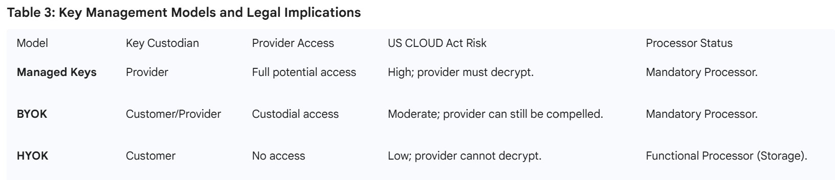 The legal classification of a SaaS provider often depends on the specific "Key Management Model" they employ. From a technical and legal standpoint, these models represent a spectrum of control and liability.