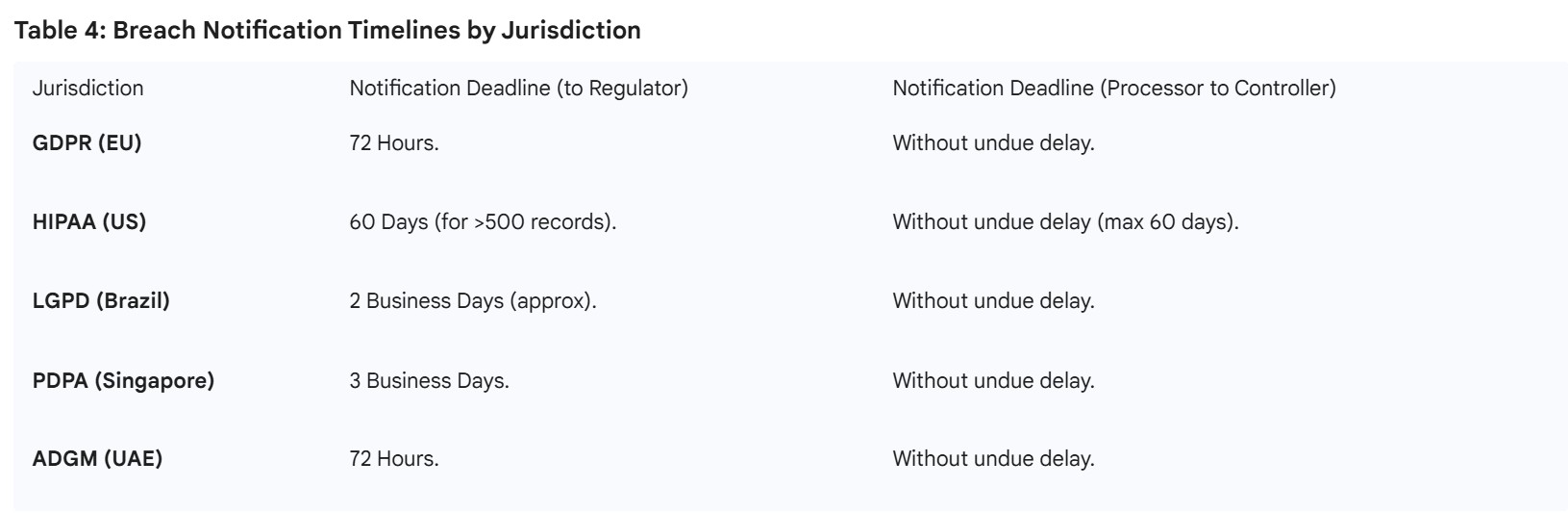 Table 4: Breach Notification Timelines by Jurisdiction