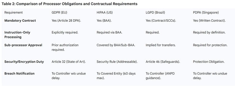 The synthesis of global data protection regimes reveals a consistent principle: the classification of a SaaS provider as a "Data Processor" is driven by the act of "holding" or "maintaining" data on behalf of a customer, and this status is reinforced—not removed—by the provider's management of encryption keys. Across the GDPR, HIPAA, CCPA, LGPD, and the UAE’s federal and free-zone laws, a SaaS provider managing a third-party cloud is legally required to execute a Data Processing Addendum (or BAA).